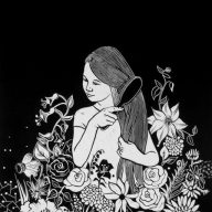 Dense linocut print with peonies, dahlias, and mixed botanicals — a richly detailed white-on-black floral pattern.