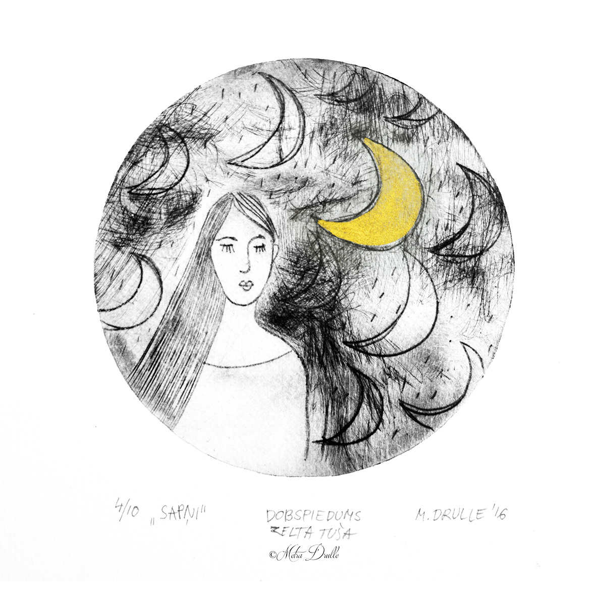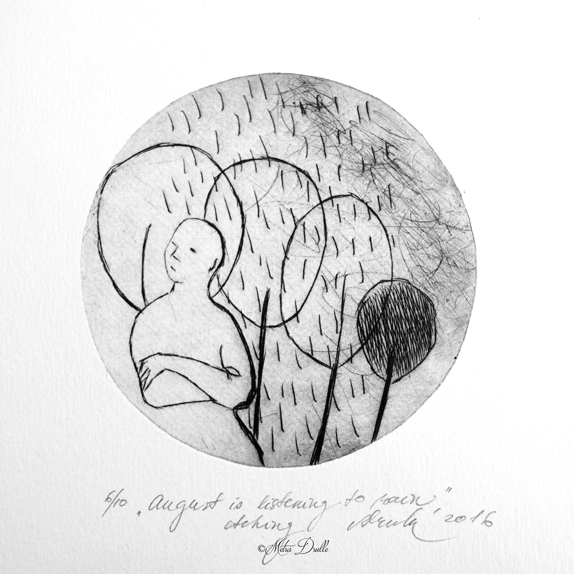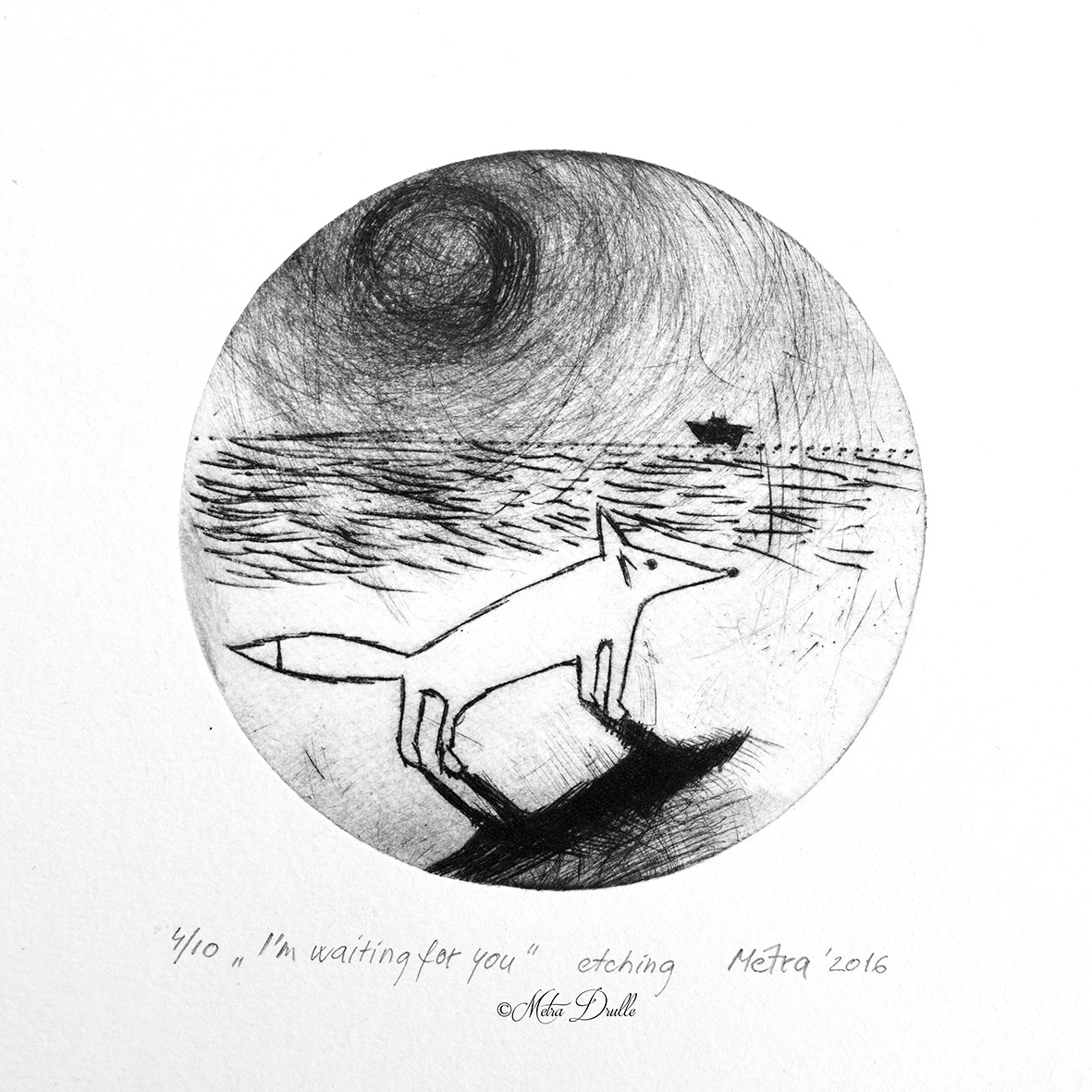 This series of small-format drypoint etchings explores the rondo as both formal structure and narrative device. Composed within a circular picture plane, each of the four works presents a self-contained scene drawn from an interior, lyrical world: August listens to the rain; The Poet’s boat navigates uncertain waters; I’m waiting for you situates a fox in a landscape of longing; The Dream closes the cycle with a figure beneath a golden moon.